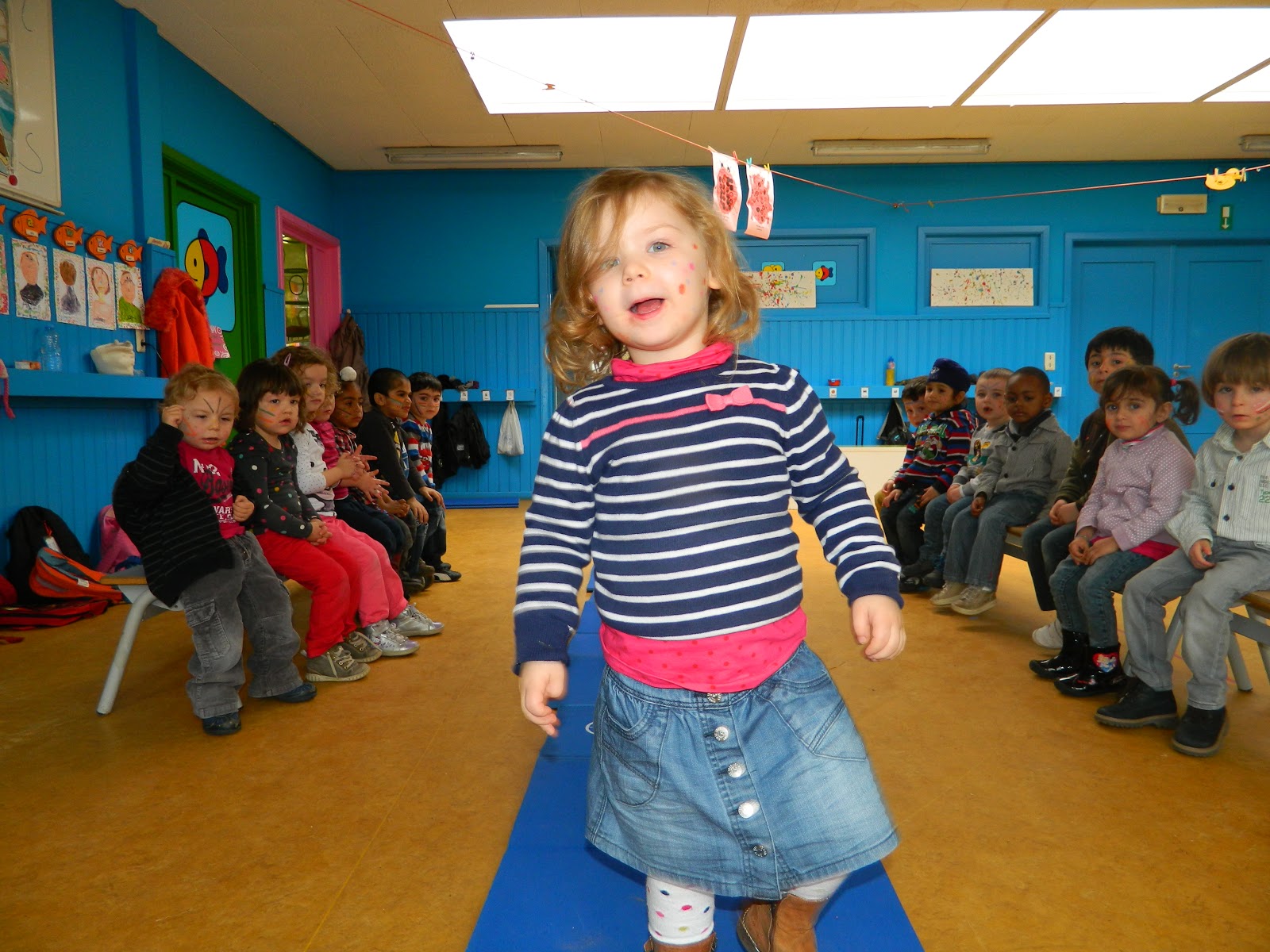 stippen en strepen modeshow gehouden. We hadden allemaal kleren aan met stippen en/of strepen. Dan had de juf ons geschminkt en hebben we in de zaal op muziek een show gegeven. Wat waren we mooi!